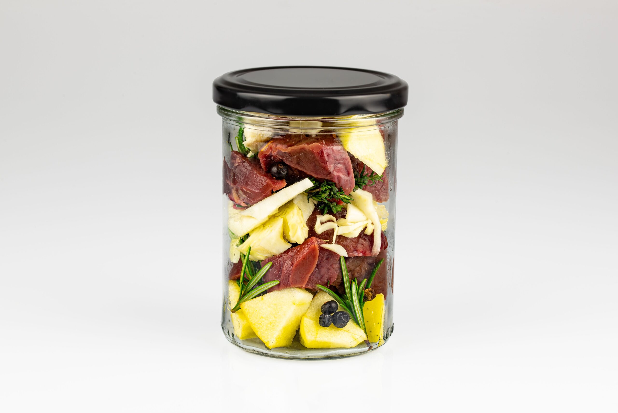 Beef 50% (meat, heart, lungs, liver, spleen, kidney), apples, sauerkraut 5%, rosemary, juniper berries, thyme