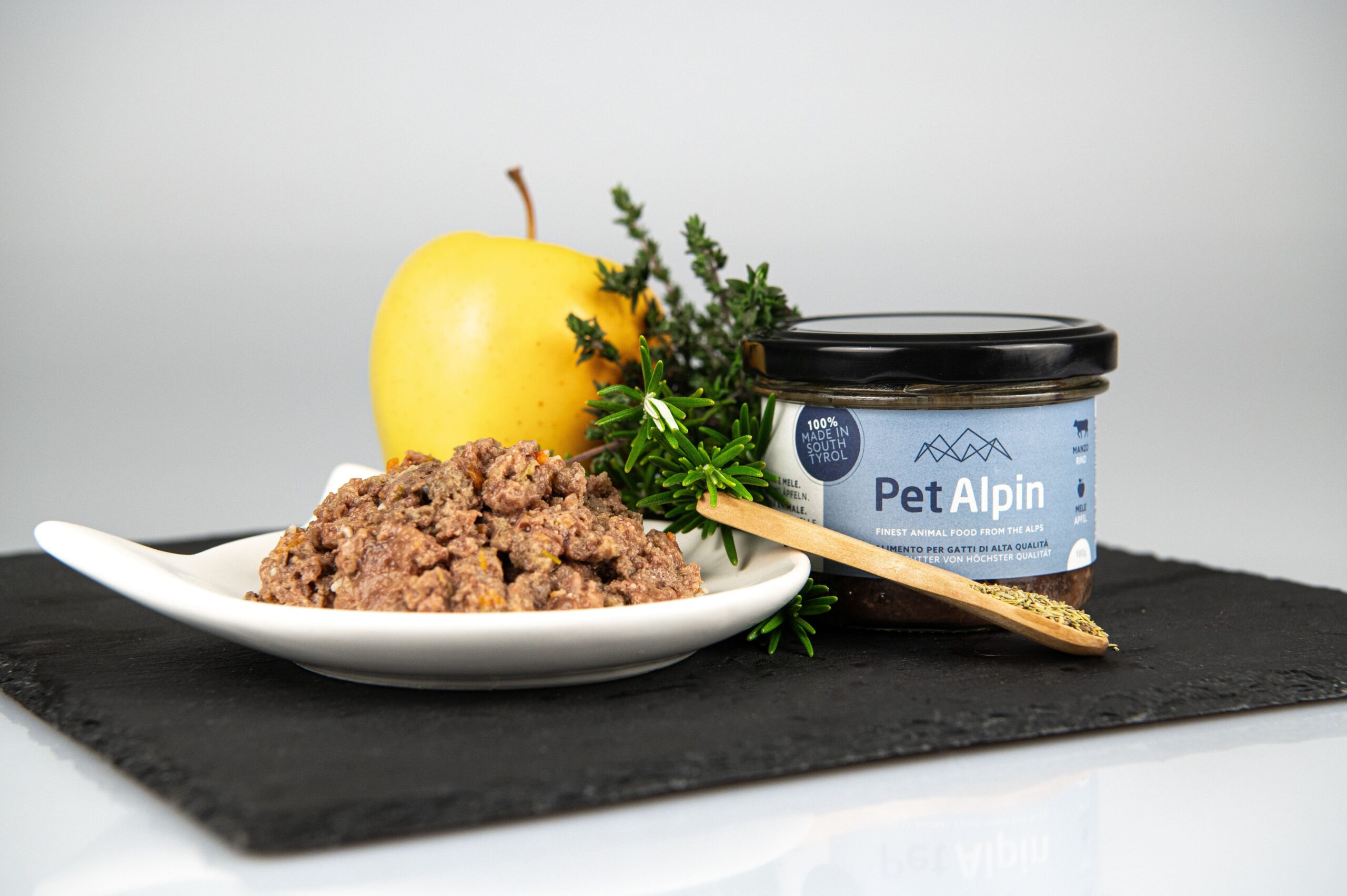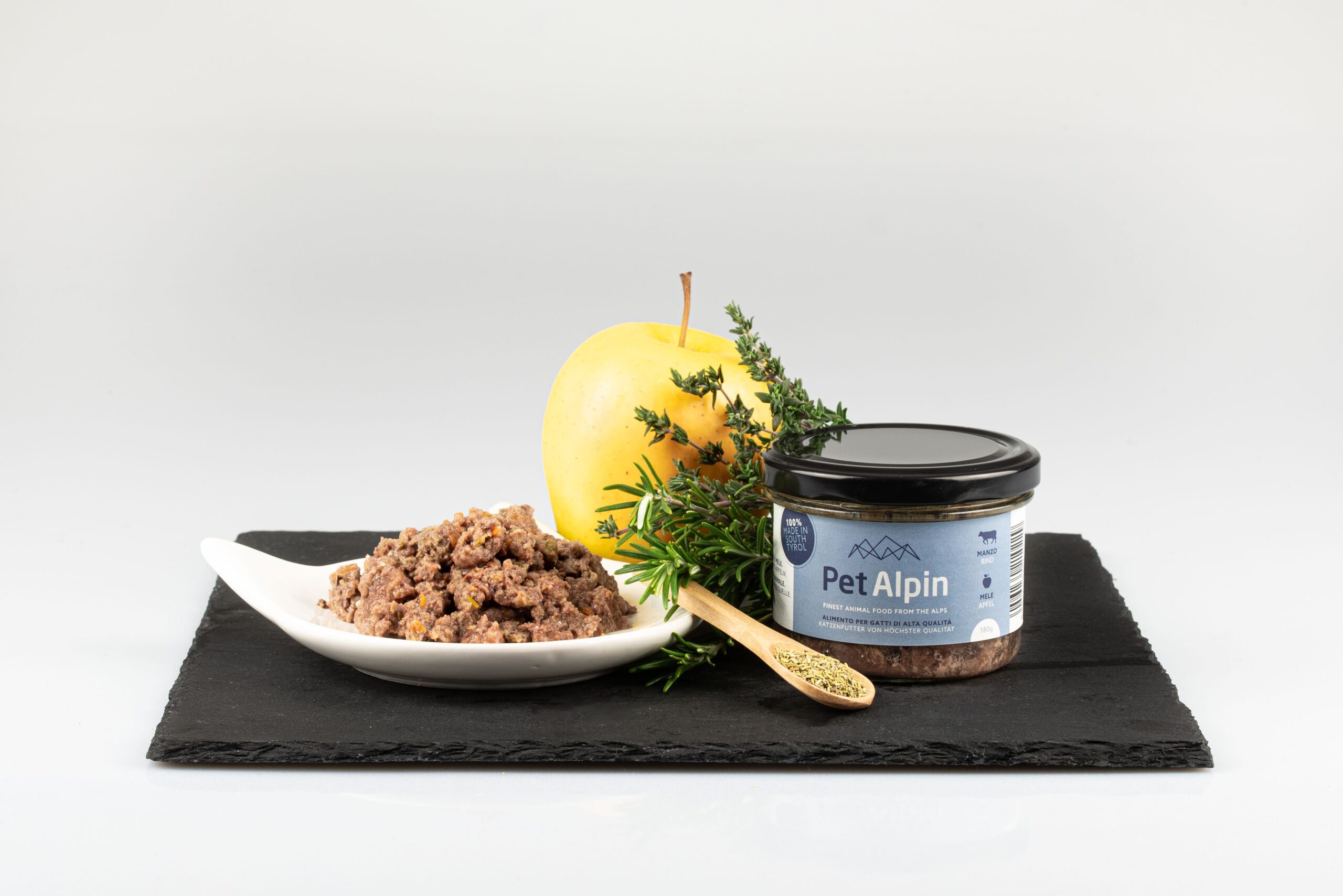 manzo 50% (carne, cuore, polmoni, fegato, milza, reni), mele 6%, carote, rosmarino, timo