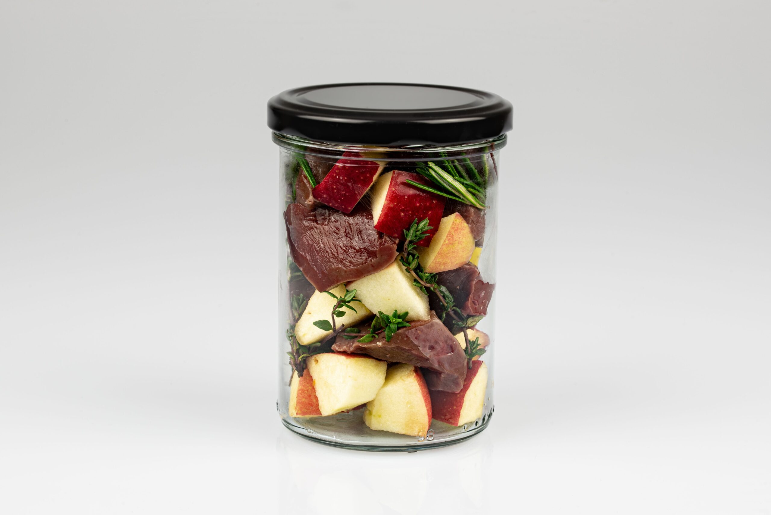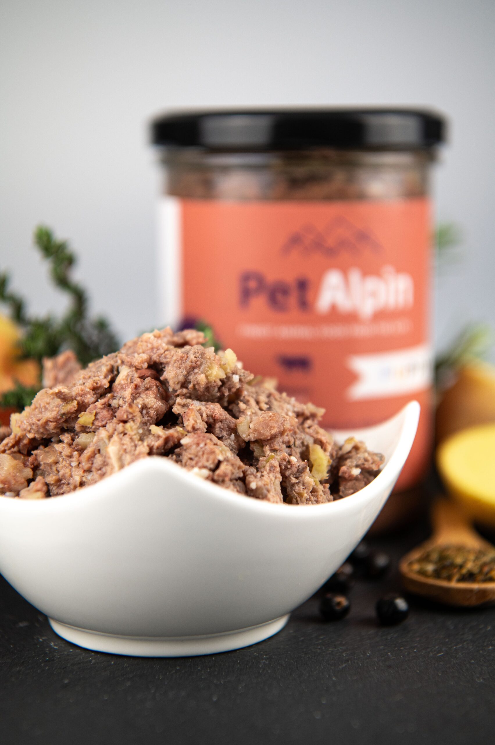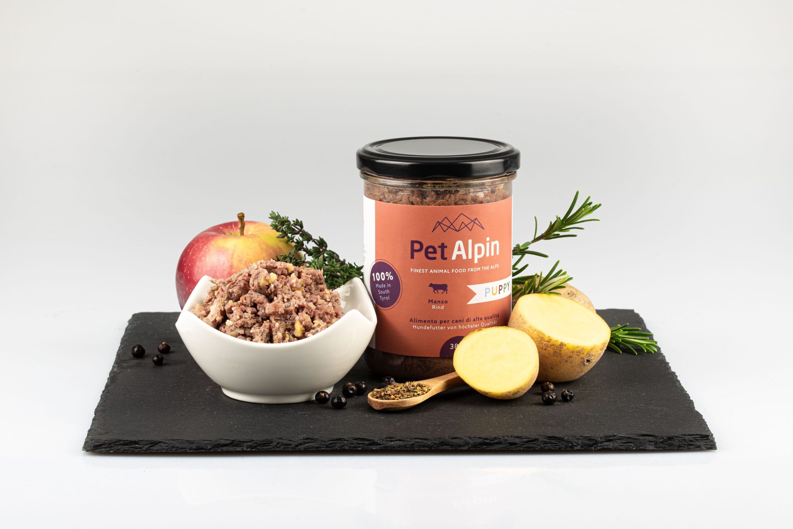 Rind 50 % (Fleisch, Lunge, Herz, Leber, Milz, Kutteln), Äpfel, Kartoffeln, Südtiroler Kräuter (Rosmarin, Wacholderbeeren, Thymian).
